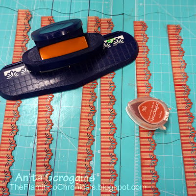 I used an older Fiskars punch, cut the strips 3/4″ wide and inked the edges. I used nine 12″ strips all together and adhered them with double-sided tape to the edges of each tier.