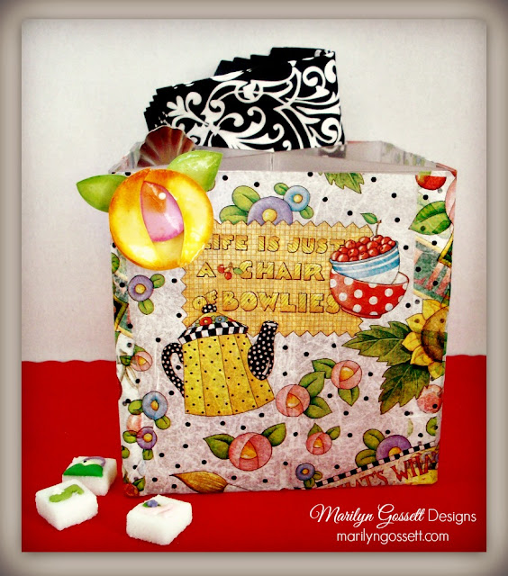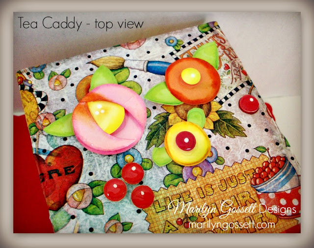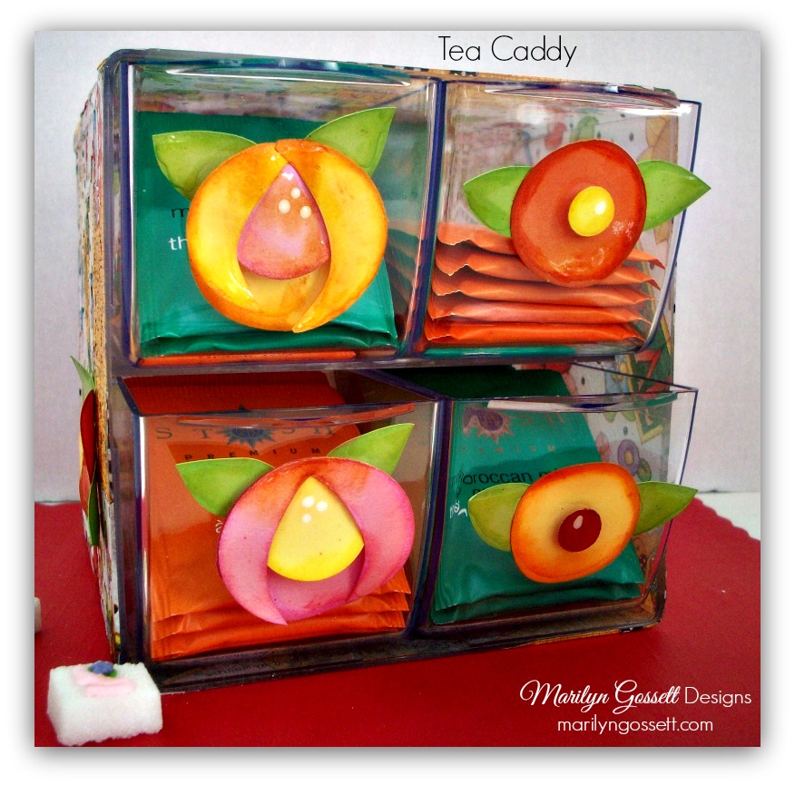First up is the tea caddy. I started out with a four drawer storage cube and decoupaged it with vintage tissue paper and paper flowers that I made.