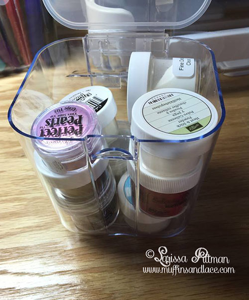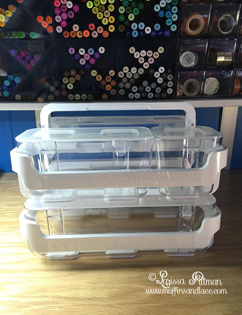 I have two Stackable Caddy Organizers, and I am storing a few different crafty items in them. I used the two smaller containers to hold some embossing powders.