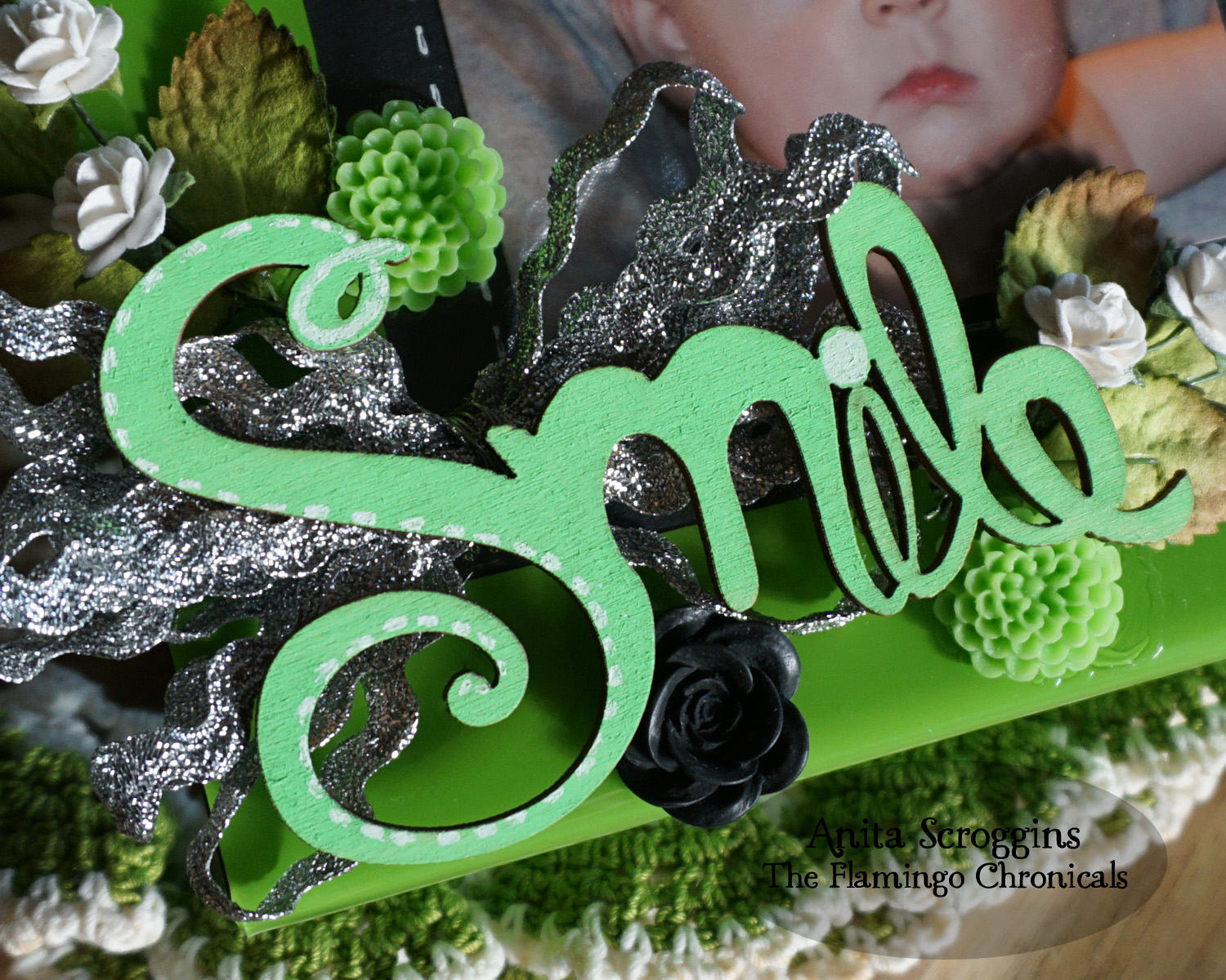 To finish off the outside of the frame, I added a bow made from silver rick rack, some paper flowers and leaves, and a couple of resin flowers. I used a white paint pen to add highlights to the wood embellishment and glued it to the top of the ribbon.
