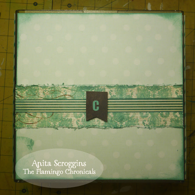 I started by covering all four sides with paper. I added some detail to the front side, distressing some coordinating papers and inking. I punched the pennants and added letter stickers.