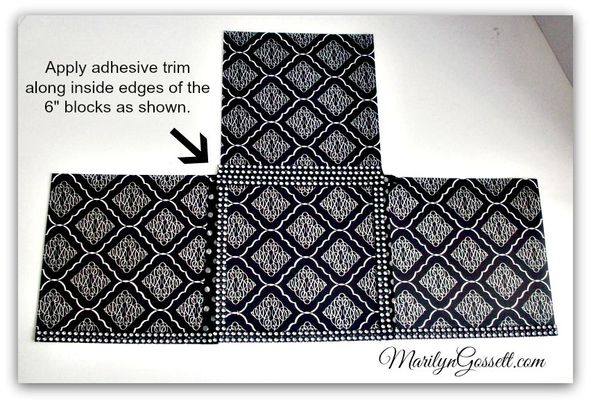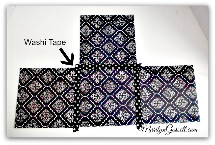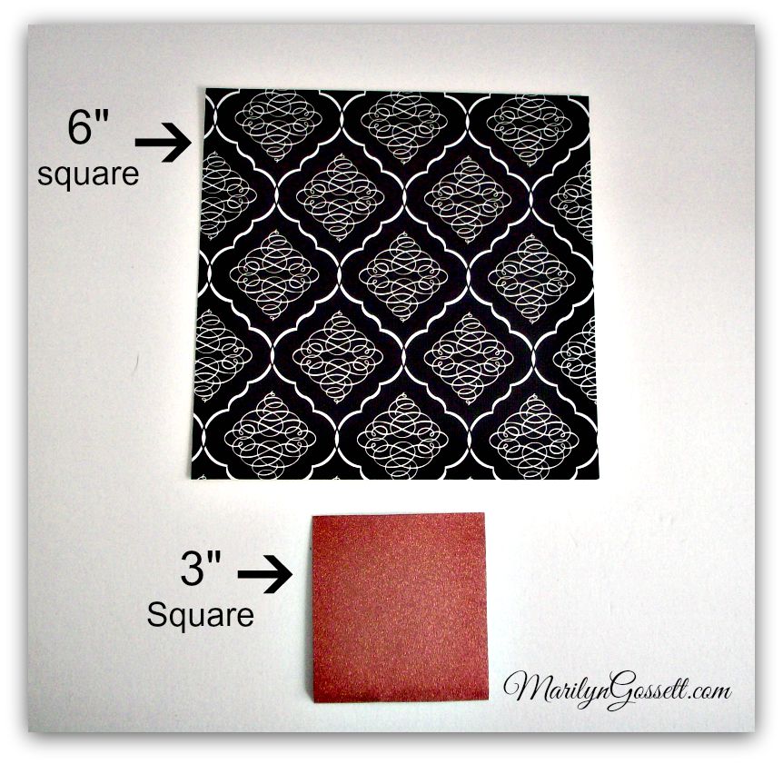 Cut four 6″ squares from one 12″ piece of patterned cardstock. Make sure the pattern on the paper is going in the right direction, matching up the pattern as well as possible. Refer to photos below to see how they are put together.
