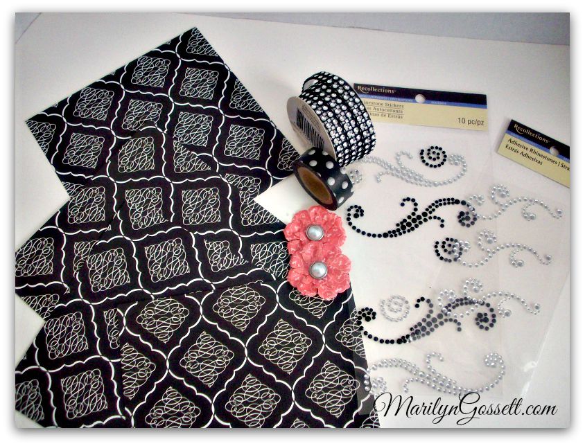 I put a removable cover on the four drawer cube that is made out of cardstock and held together with washi tape. I further embellished it with self-adhesive faux rhinestone trim. (I got it at Michael’s one of the dollar bins).