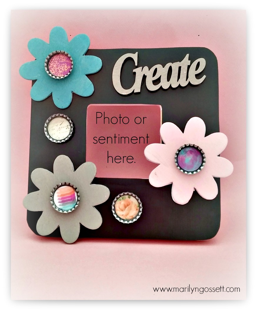 Read on, and I will explain. My first idea was to make this a magnetic frame with various magnets that could be moved around on the frame. I gathered up some bottle caps that I had previously decorated and some wooden flower shapes. I had an idea while doing this…. thinking that individual pictures of the family members could be punched out to fit inside the bottle caps….and a family group picture could be placed inside the frame. That was a different idea of what I was doing, but I still think it is a good one!