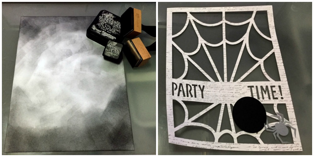 For the inside decoration I created a background using distress ink in two different colors: Black Soot and Hickory Smoke. Then I found a net design on my Cricut, resized it and cut it using a 49 Shades of Gray paper and pasted over the inked background that I created before. I want to simulate a dark night but not a scary night because it is a Party time!