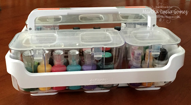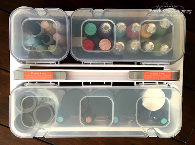 Now I want to show you how I am organizing all the little bottles of crystal drops, sprays, textures and mediums in my Atelier! The best part is that I have them all in one place and I can always carry it with me. Take a look of my new Stackable Caddy Organizer from Deflecto.