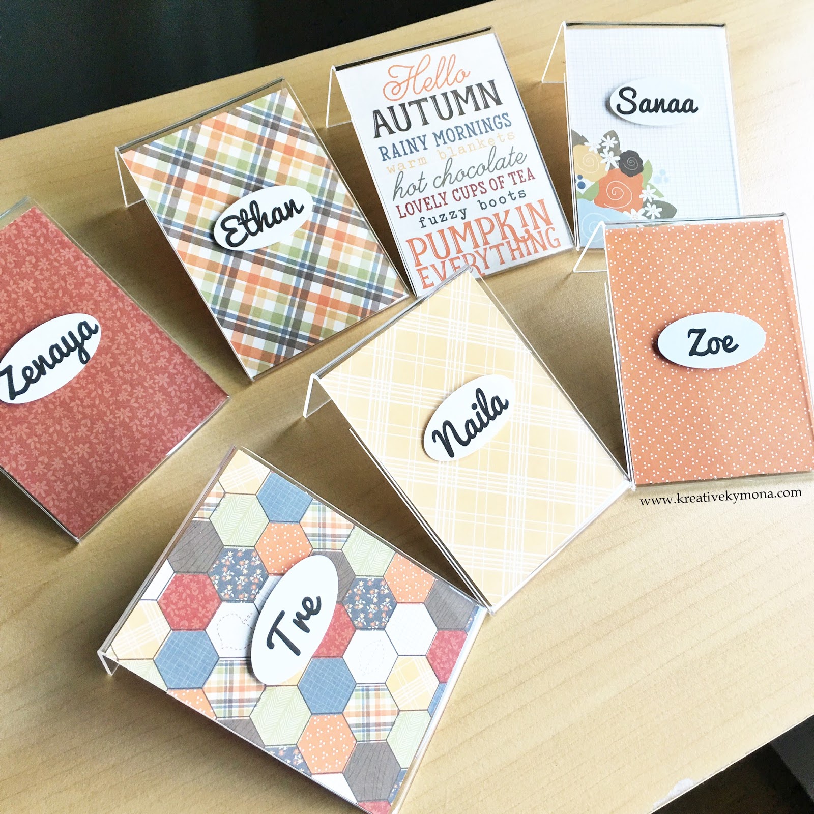 Creating these were simple! All I did was cut Simple Stories Hello Fall pattern paper down to size seven times. Then I used Photoshop to create the name tag for the Mini Slanted Sign Holder 1½” x 2″. I then used an Oval Punch to cut out the names then adhered them to the pattern paper using a dimensional foam adhesive.