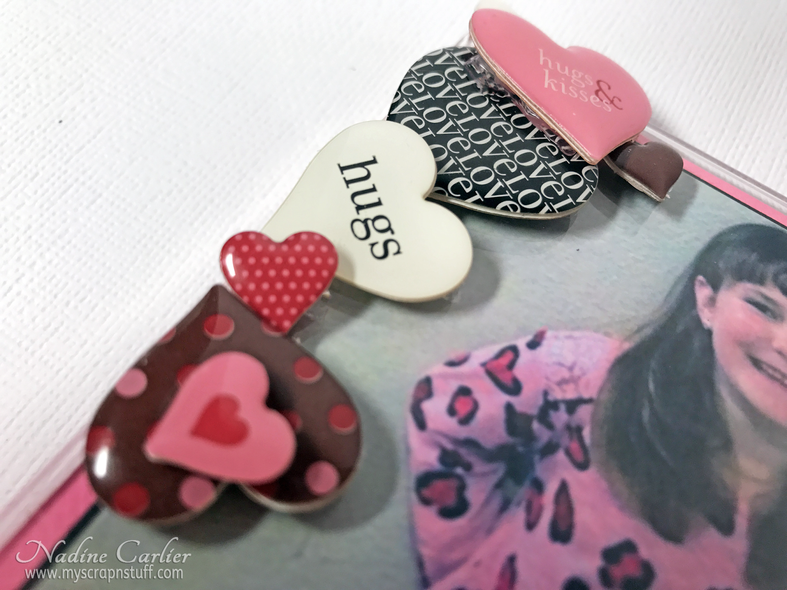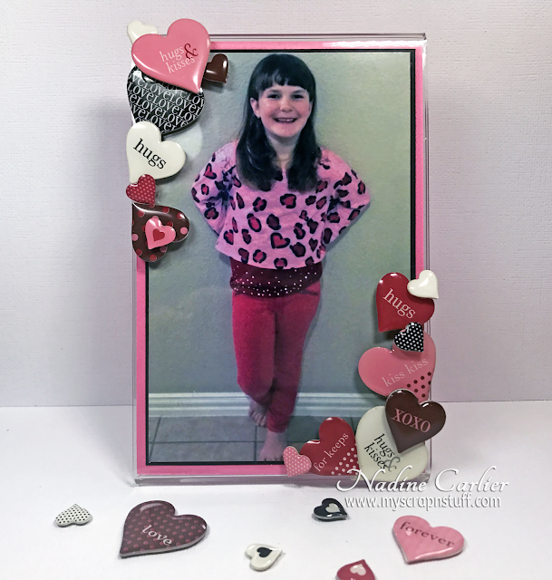 Hello! Nadine here and today I have a cute Valentine frame that I created using Deflecto Crafts 4″ x 6″ Clear Frame. I used a photo of my daughter dressed all in pink and she is looking forward to giving the frame to here Grandma for Valentine’s Day. I used a hot glue gun to adhere the hearts to the frame. I have had these hearts for at maybe 9 years, I don’t even remember who makes them or where I got them.