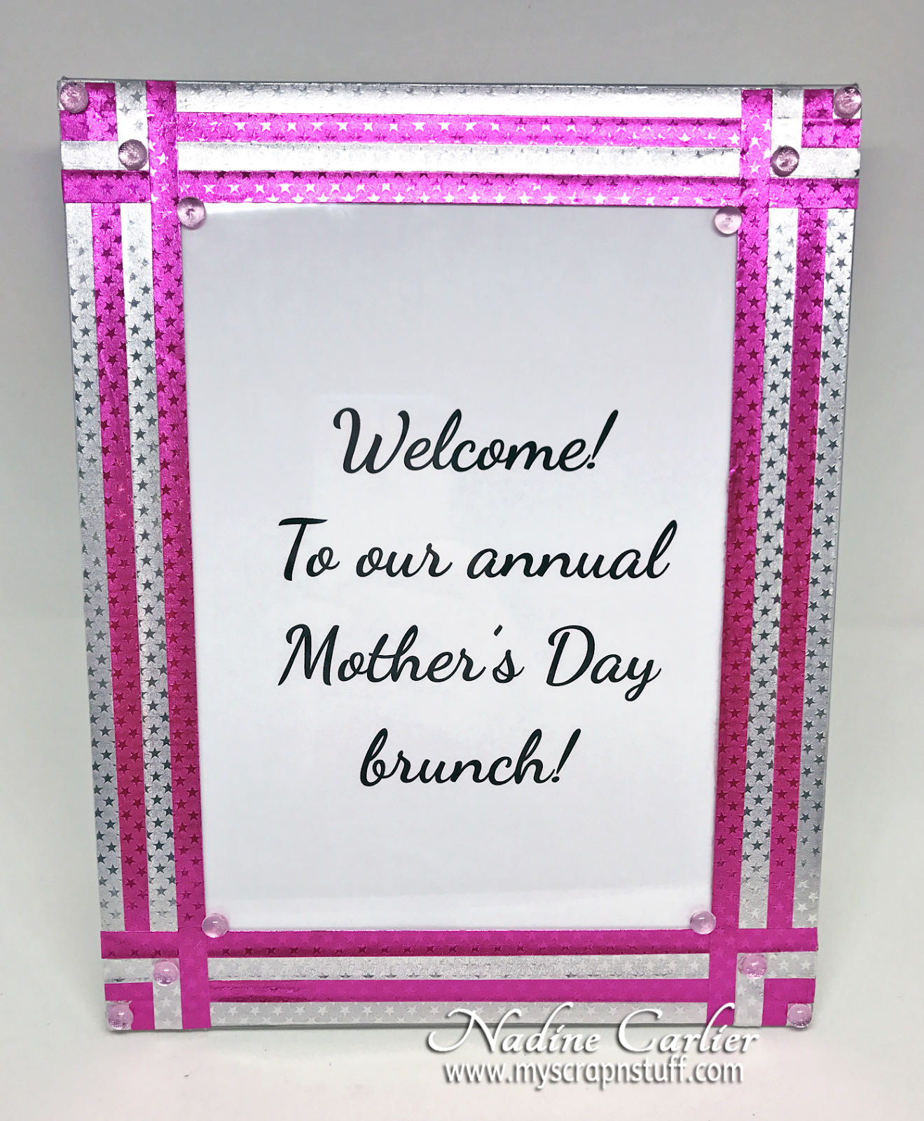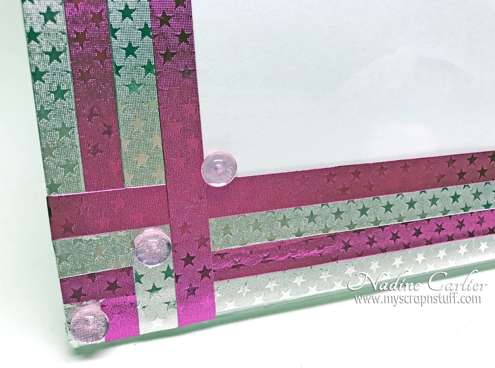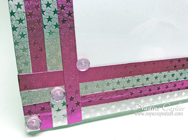 I cut ¼” strips from the Rinea Silver and Fuchsia Star Struck Foiled Paper and adhered them to the frame alternating them to get a weave like pattern.