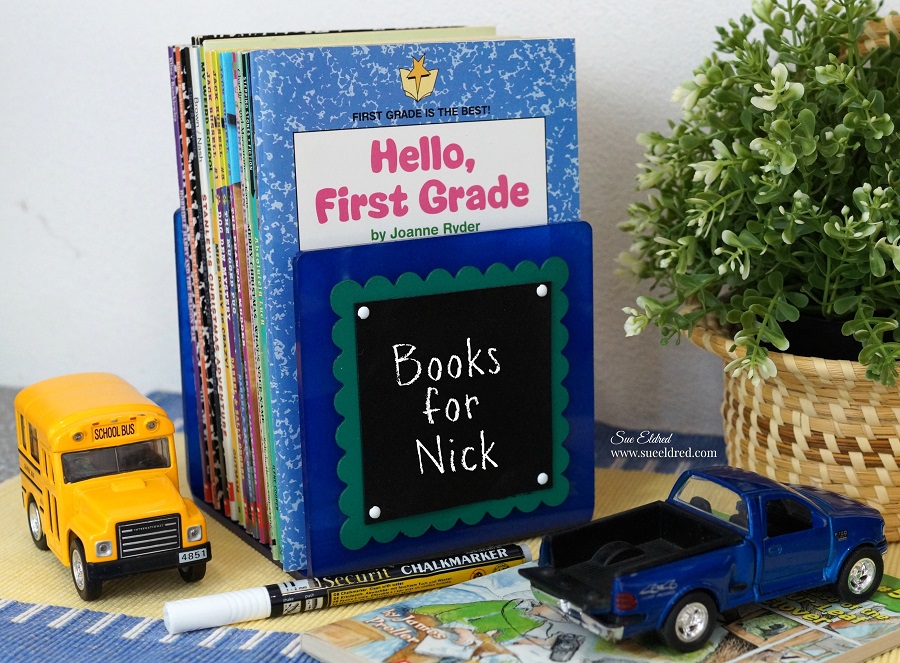 I die-cut a scalloped square from black chalkboard vinyl (Sign Tags w/Wet Erase Marker)