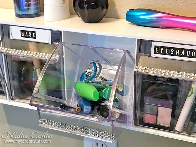 Each bin tilts out for easy access, and they can also be removed so you can bring them to where you need them. I blinged mine up with some rhinestone trim and used alpha stickers on the labels that come with the unit.