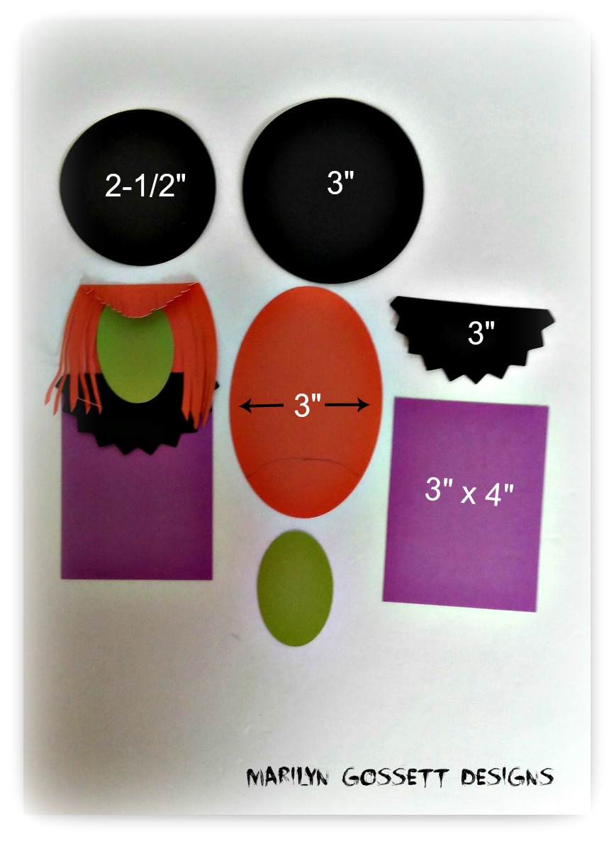 3. For the hat: Fold the 3″ black circle in two. Form the 2-1/2″ into a cone and adhere to the top of the 3″ brim. Hair: Fold down the top edge of the orange oval (for the bangs). Cut a fringe into the oval for the effect of hair. Cut from each side. Adhere the head to the hair.