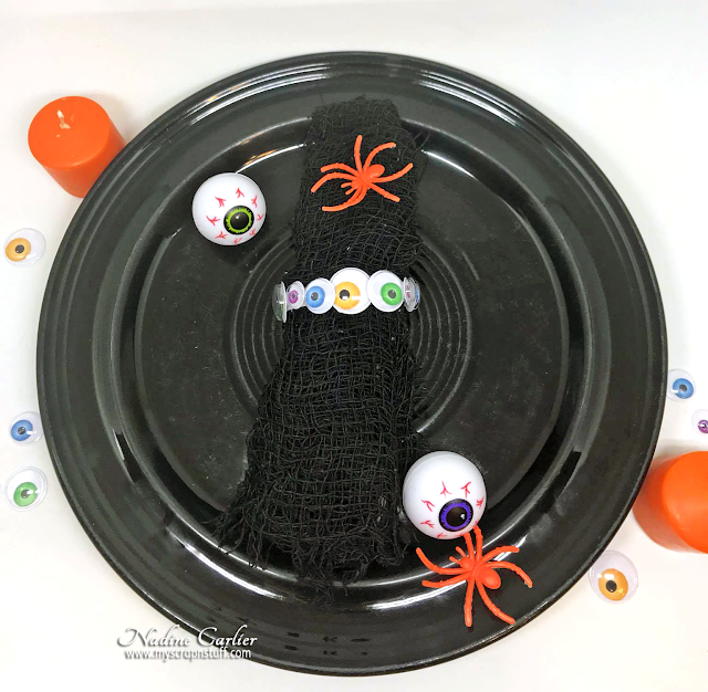 Hello! Nadine here today sharing a quick and easy napkin ring my daughter and I created using Deflecto’s Flexible Sign Danglers. All we did was bend them around so they were in oval shape and then hot glued on some googly eyes around the sign dangler.