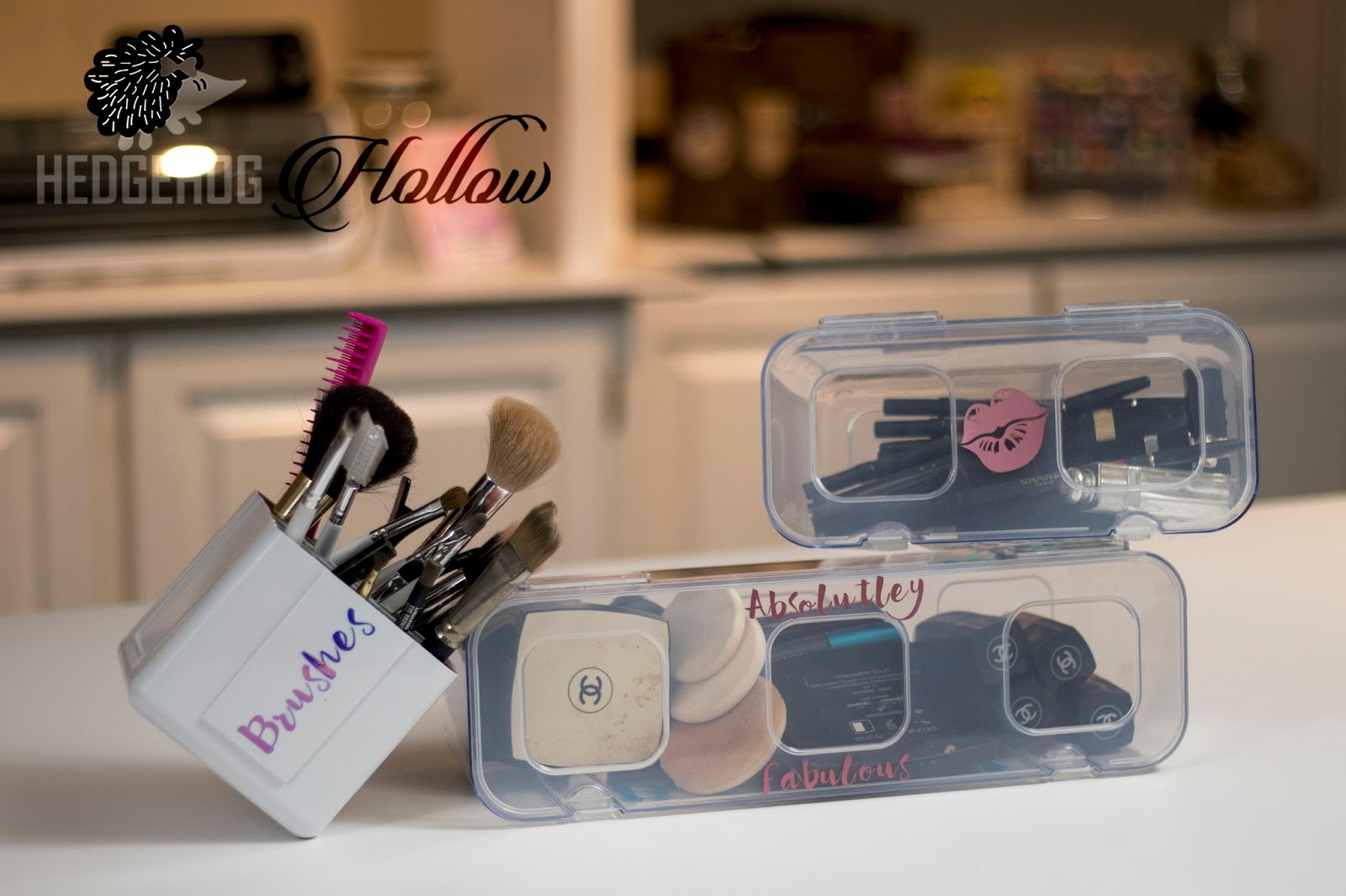 I added brushes on the side using my new Cricut Maker machine and some Pink Holographic Vinyl (all listed at the bottom of the post in my supply list). It’s actually labeled as a marker holder but I added my make-up brushes, eyeliner, mascara, my big hair clips for when I’m blow drying or doing foundation plus my favorite comb. You could also add your brush, lip liner, lip gloss and more, they are stretchy silicone squares that are so practical and have so many options.