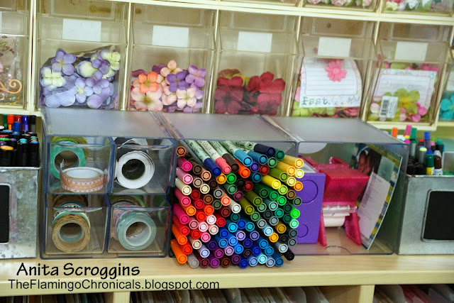 Craft Tilt Bins™ are one of the best ways to help keep order. You can fill a wall with them -and store more than you can imagine. Here I have organized paints, mediums, brushes, and inks all in one place. I have removed some of the actual bins to better store my smaller bottles of paint.