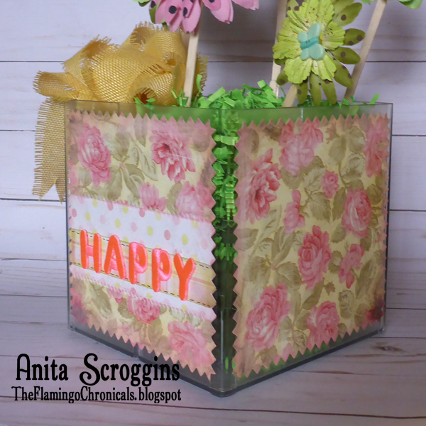 Adhere the papers to all sides of the cube. Cover the floral foam with paper crinkles (the Dollar Tree is a cheap place to pick these up!) and insert your flowers into the foam. Add a ribbon to the cube and you are done! I am also going to decorate some pencils and add to the cube – I think those would be so cute!