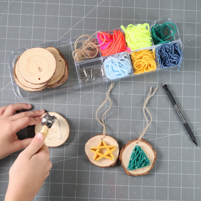 Erin creates the ornaments by drawing simple shapes onto the wood slices and adds small nails to the design while adding a little loop to the end of the yarn to start winding it around the nails. With a little help pounding in the nails, even younger kids can make these ornaments.