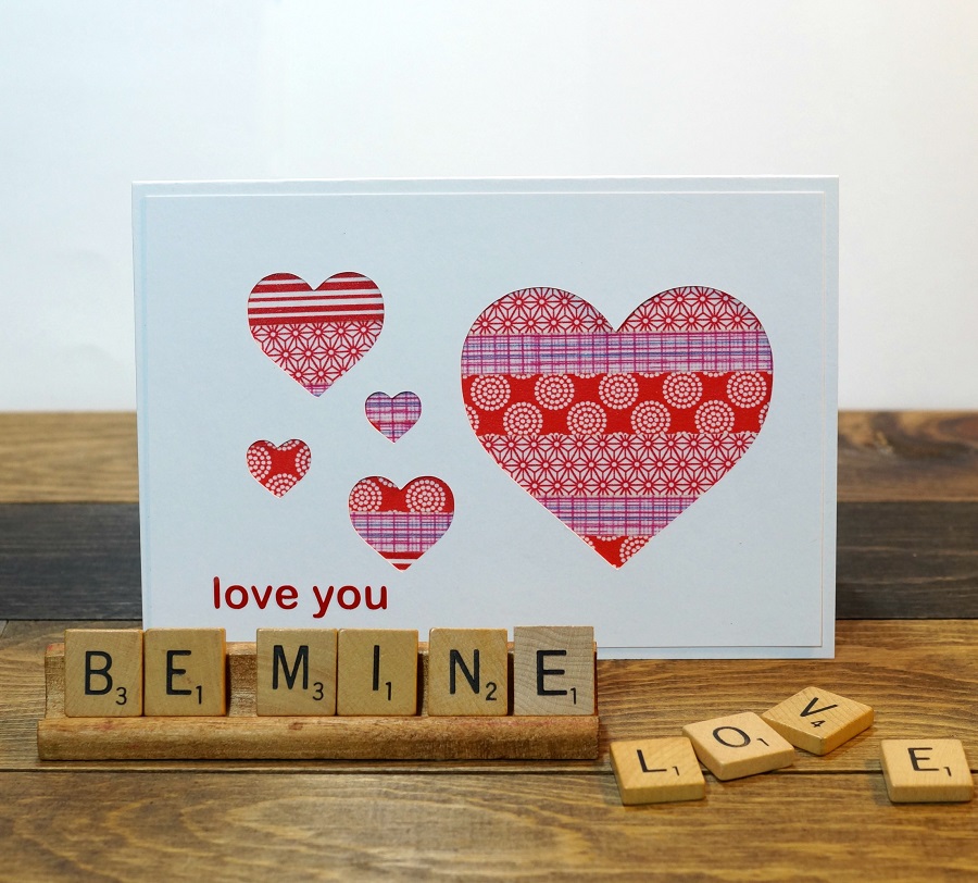 - Use a tape runner to adhere to the cut-out heart layer onto the front of the card, aligning it with the washi tape.