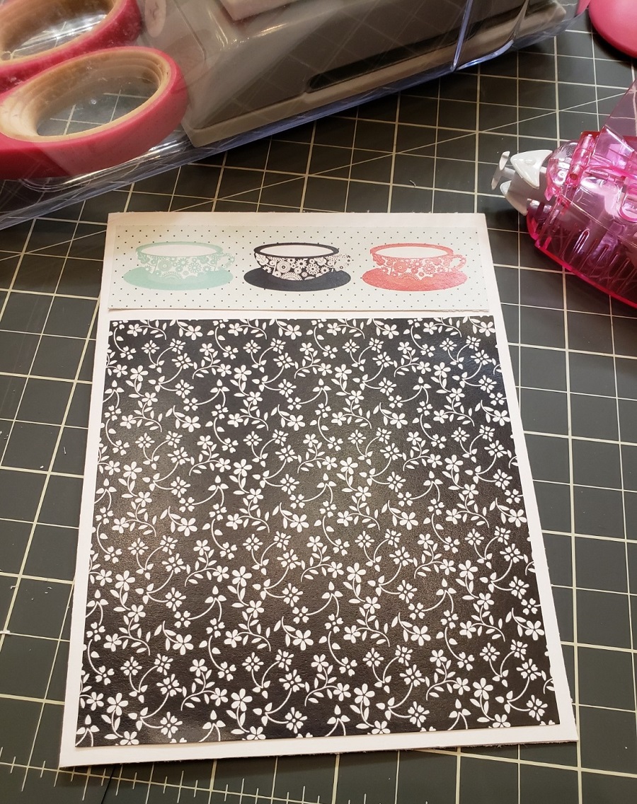 - Cut a second coordinating piece of paper and adhere to the lower section of the card.