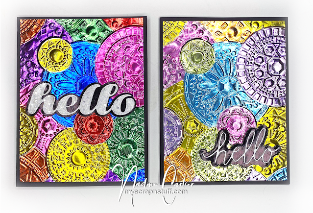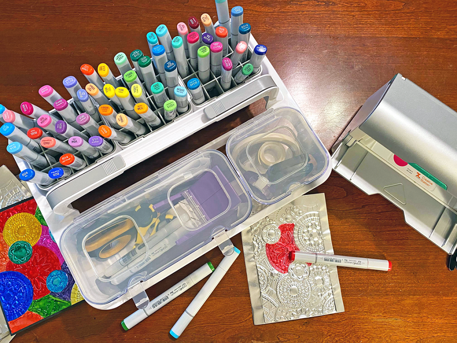 - Color the embossed parts of the silver foiled paper using the alcohol markers in a variety of colors.
