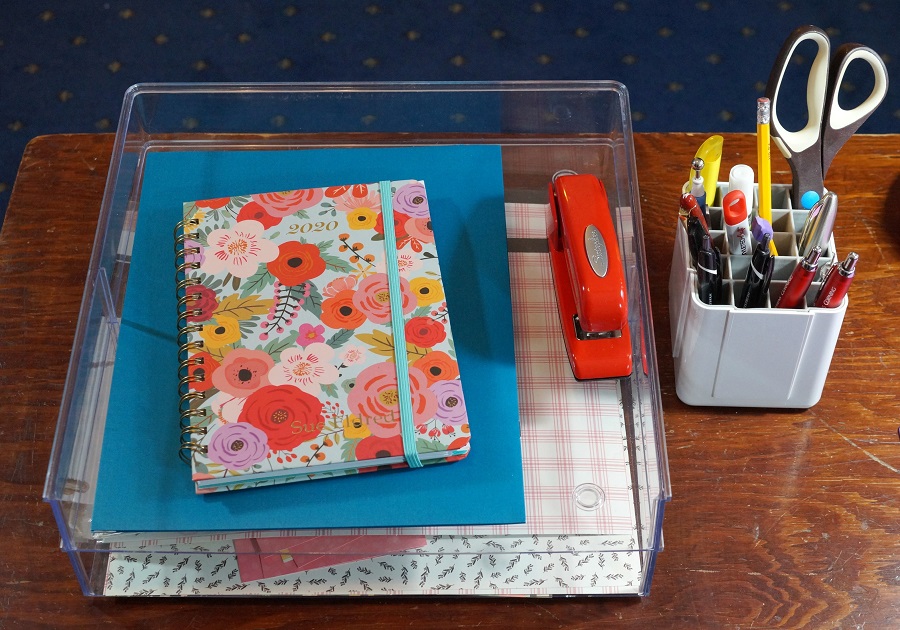 Sue uses a variety of new and vintage items to organize her craft/office space. On her desk, she likes to keep it as clutter-free as she can. The Deflecto 12″ x 12″ Stackable Storage Trays