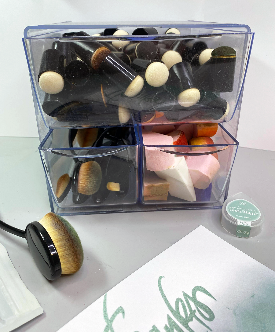 “I do a lot of ink blending and have a lot of different ink blending tools. Some of them are small and hard to keep organized. I started using the Deflecto Stackable Cube with 2 Drawers and also with 4 Drawers. Because I have so many sponge daubers, I took one of the bigger drawers from the Deflecto 2 Drawer Cube and exchanged it with 2 of the smaller drawers from the Deflecto 4 Drawer Cube to fit all the daubers in and so that all of my ink blenders are all in the same cube.”