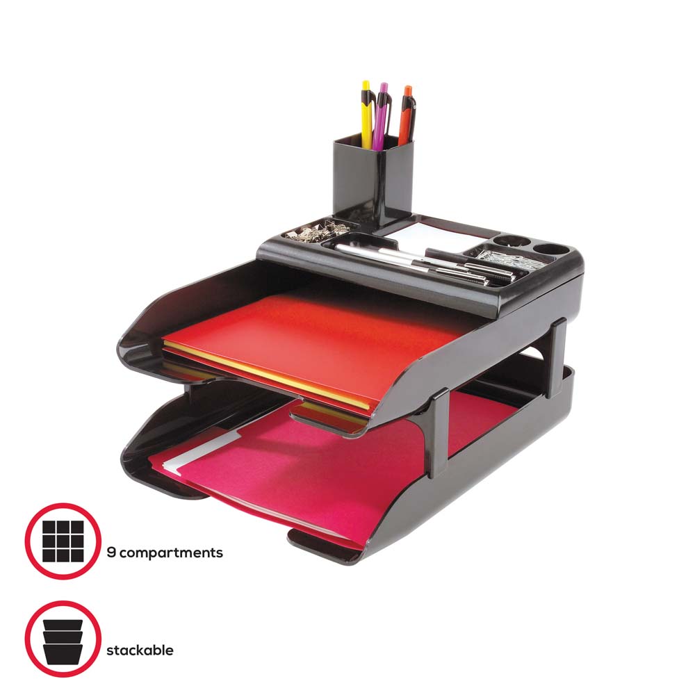 Sleek, ergonomic tray design features nonslip, anti-scratch pads that won’t damage desktop surfaces. Two letter-size trays organize and store important papers and files, while the convenient supply organizer and pencil cup sit atop the tray for easy access. or can be used alone. Sturdy tray risers allow the trays to stack for vertical organization. Finished in black metallic plastic to enhance this high-profile, modern desk set.