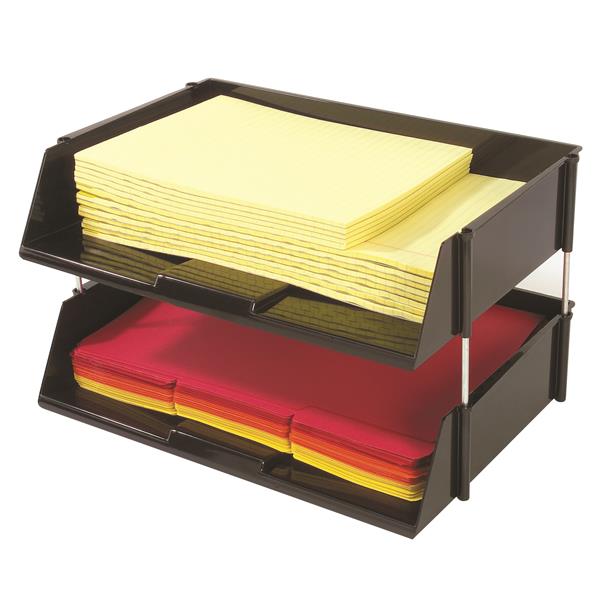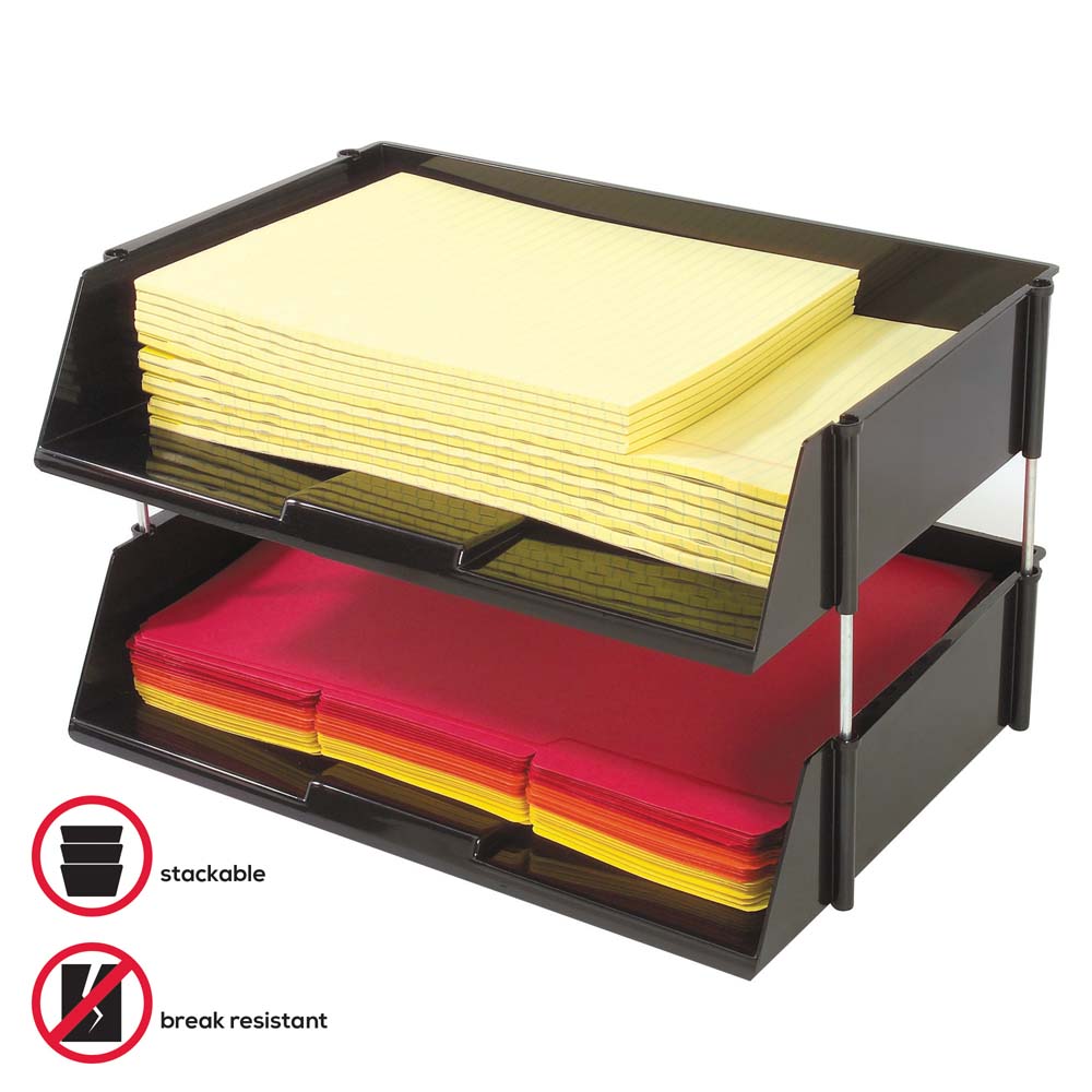 Bring order to your office and collect all important files and documents in one place, or simply keep paper supplies within reach! Deflecto’s Industrial Tray Side-Load Stacking Tray has the capacity to hold over 1,500 sheets of paper, catalogs, directories, and large files, making it ideal for high traffic areas or industrial usage. Made from extra sturdy plastic, this oversized desktop tray set is break resistant and will hold up to busy environments. Its stackable design allows you to maximize desk space, and the metal risers included provide additional strength for heavy loads. With a classic black color and simple lines this Industrial Tray Side-Load Stacking Tray will match any office or workspace decor. Great for use in traditional offices, storage spaces for office supplies, print and copy areas, warehouses, and more!