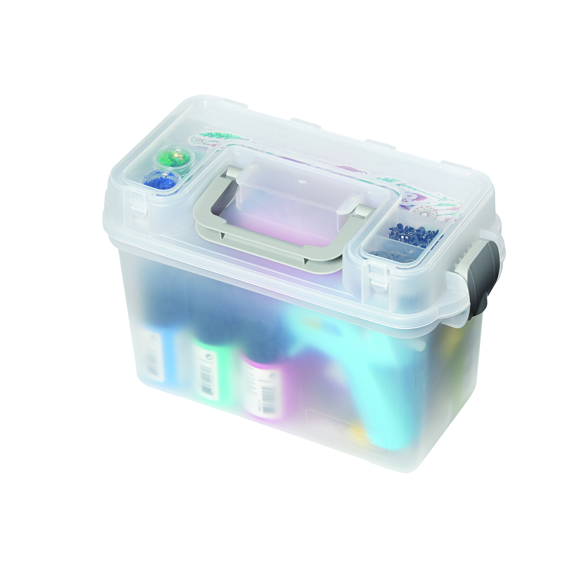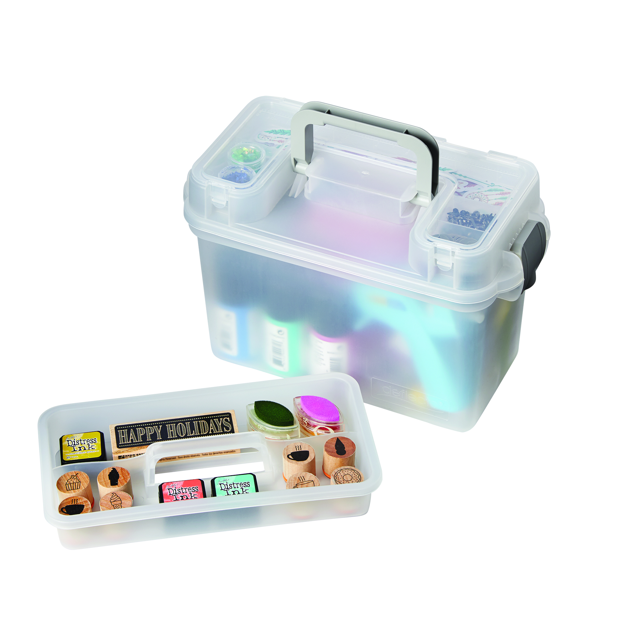 Deflecto’s Mini Storage Box is a great way to organize small art supplies, sewing materials, rubber stamps, and much more. This clever storage solution includes a removable tray for added organization and even more storage built into the lid. It’s perfect for crafters, sewers, students, fine artists, and makers. Best of all, the storage box is clear so you can find what you need fast.