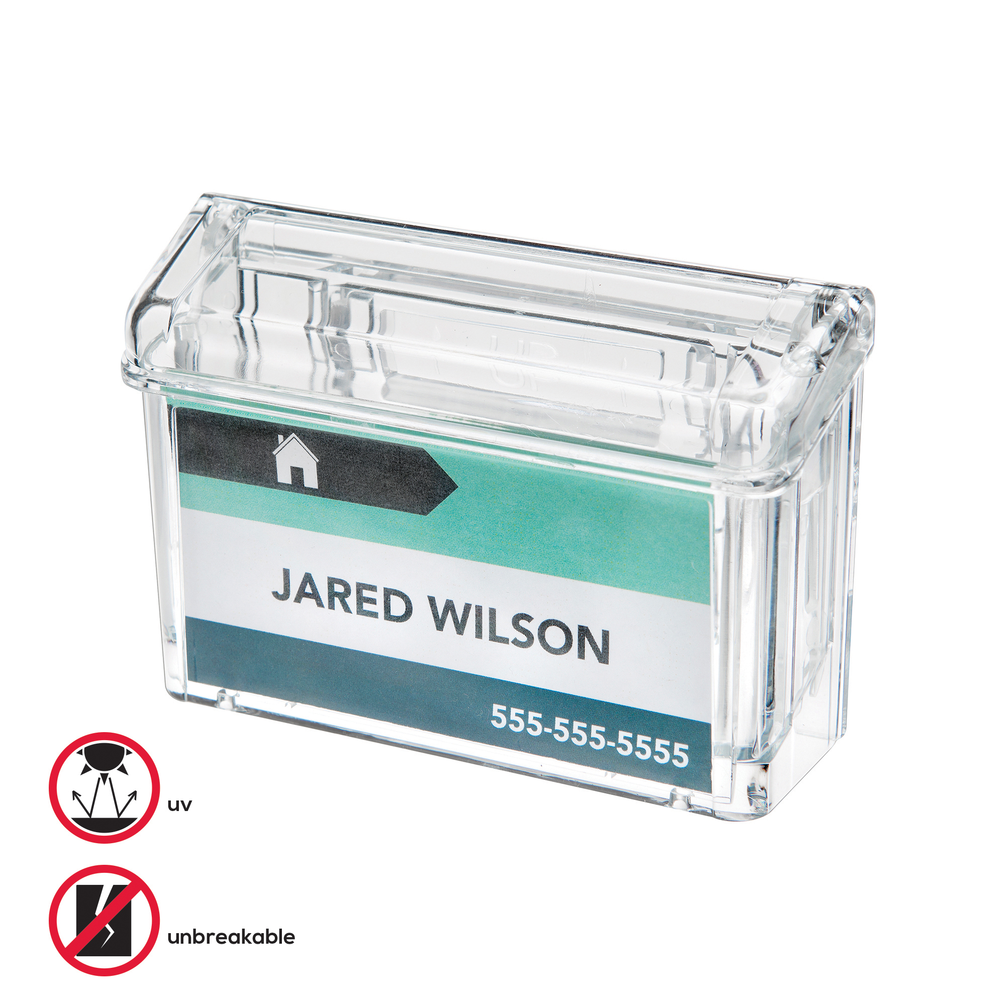 Grab-A-Card® outdoor business card holder allows potential customers to easily and conveniently take contact information. Holds up to 50 business cards, and includes a detachable mounting plate and adhesive tape pads. It is unbreakable, weather-resistant, and UV protected against fading.