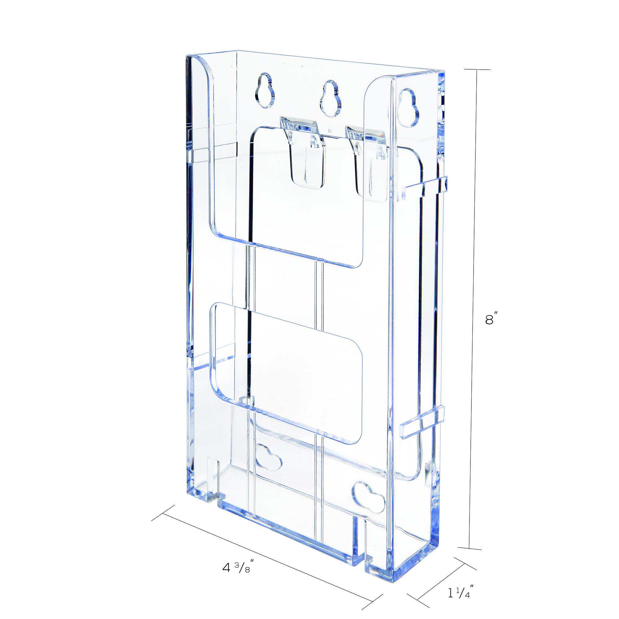 Color Clear Item Height 8.0 Item Length (Depth) 1.25 Item Weight (lbs) 0.33125 Item Width 4.375 Material Polystyrene Piece Height 8.0 Piece Length (Depth) 1.25 Piece Weight (lbs) 0.333 Piece Width 4.37 Product Category Wall Mount Systems Total Pieces Per Case 12 Type Wall Mount