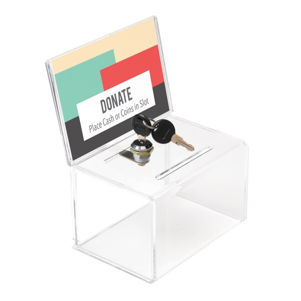 Small Coin Box allows you to create interest in your charitable campaign with a removable sign holder to display your message. Includes a lock and two keys.