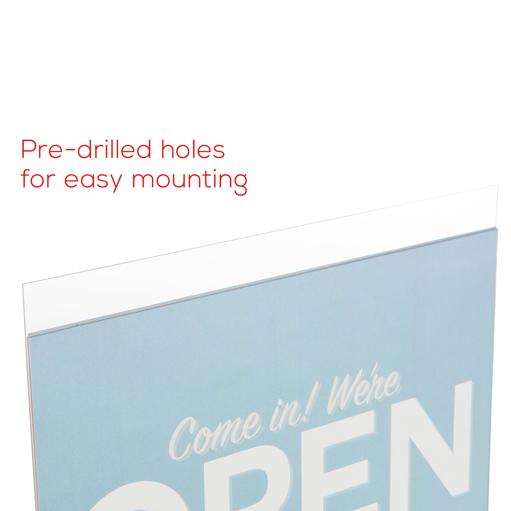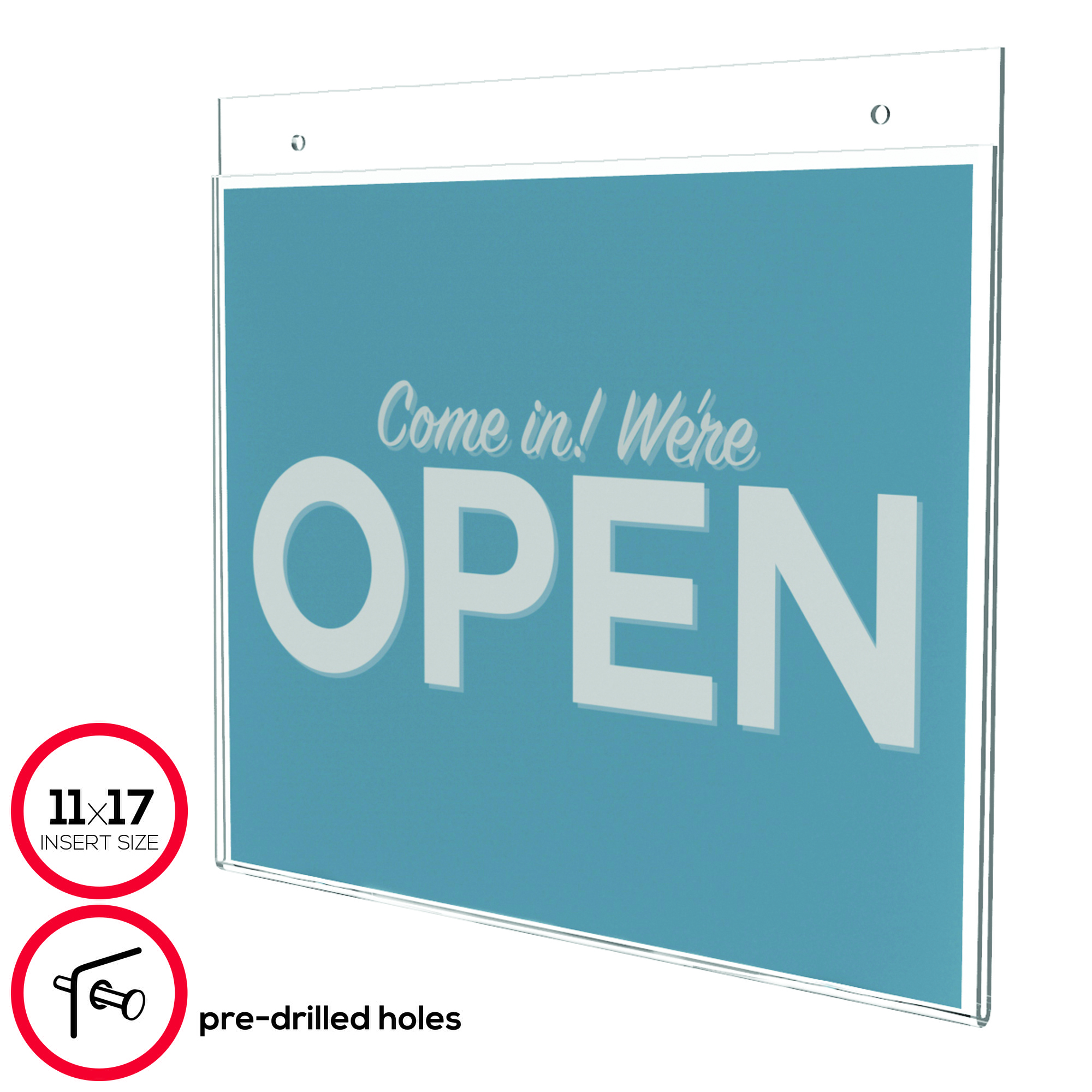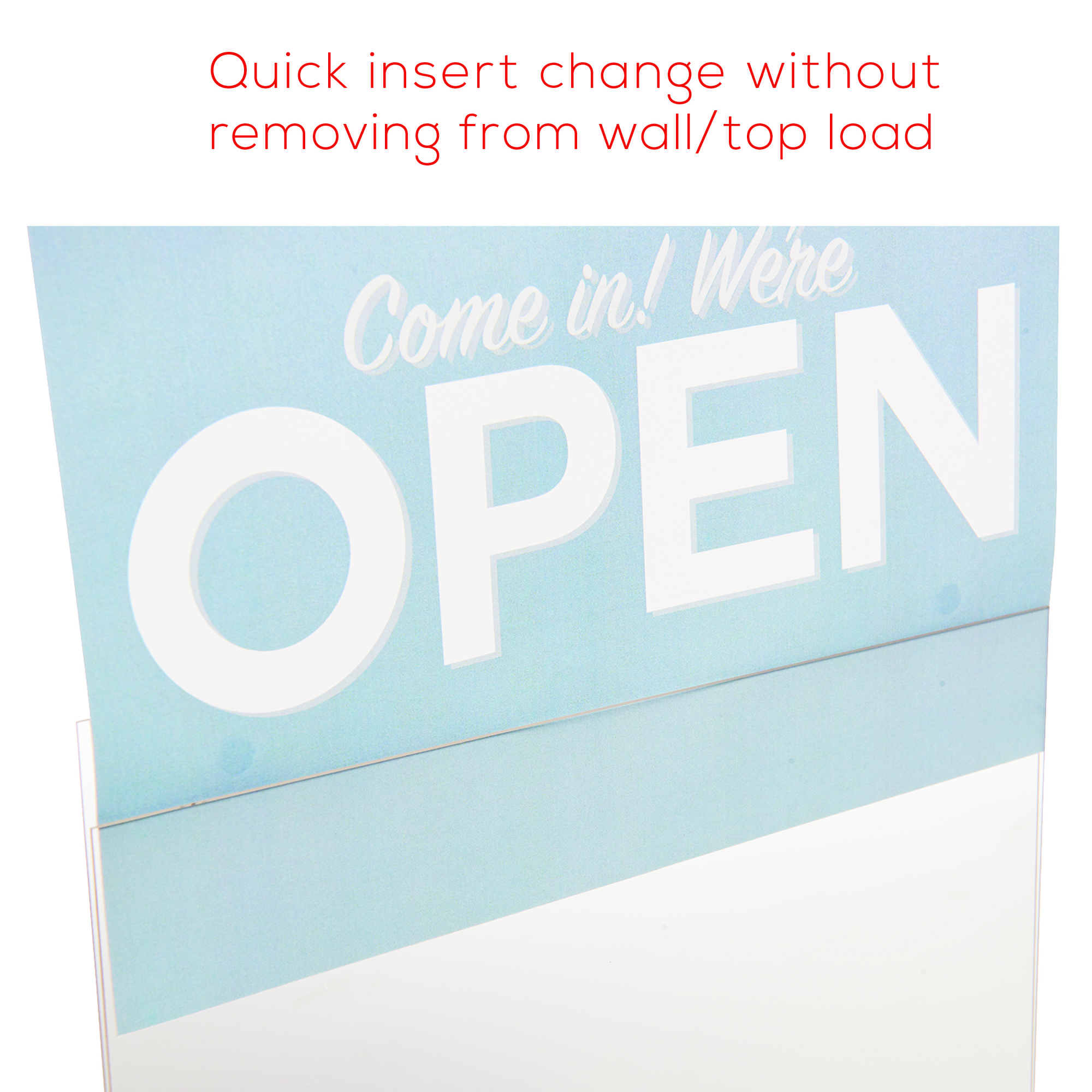 Take advantage of empty wall space and save valuable counter space with these convenient, easy-to-use wall mount sign holders. The transparent design offers full visibility to your message. Perfect for any retail or commercial setting, these sign holders attract attention and are an effective way to communicate, protect and display information in a way that’s easy to use. Whether you’re advertising daily specials, promoting and event or delivering a message, these sign holders will grab your customer’s attention. Top-loading, plastic sign holders have pre-drilled holes to make wall mounting easy. Quickly change out inserts without removing them from the wall.