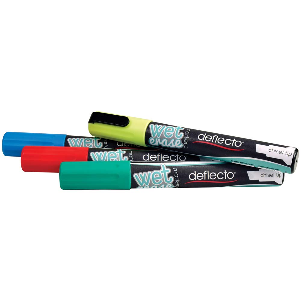 Make your mark with Deflecto® highly visible, smooth marking wet erase markers for use on wet erase boards, windows, mirrors and other nonporous surfaces. Perfect for retail store use, restaurant boards, classroom windows and more. Chisel tip for fine or bold writing. Odorless and UV-protected against fading. Wipes clean with damp cloth; leaves no ghosting. Non-toxic markers conform to ASTM D-4236.
