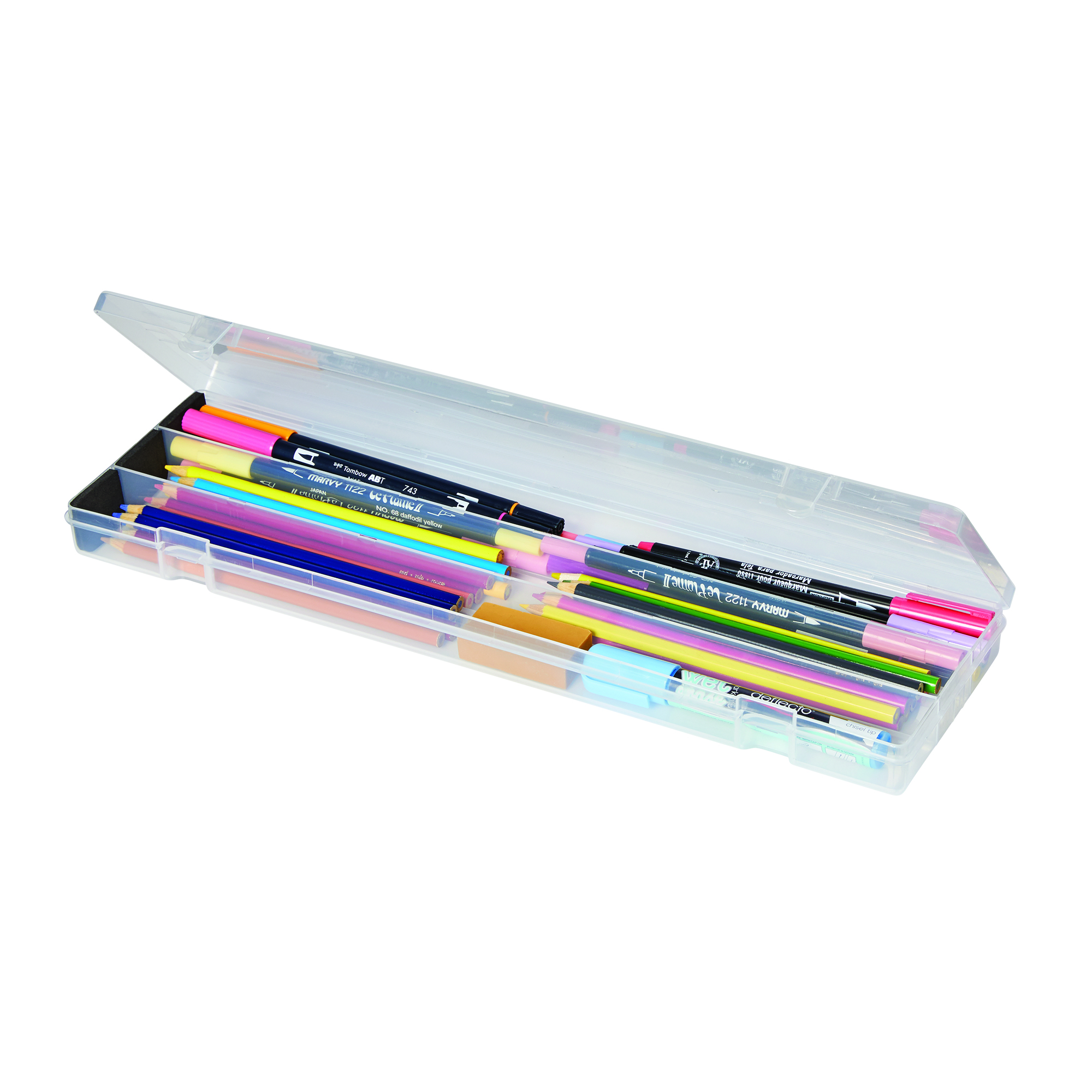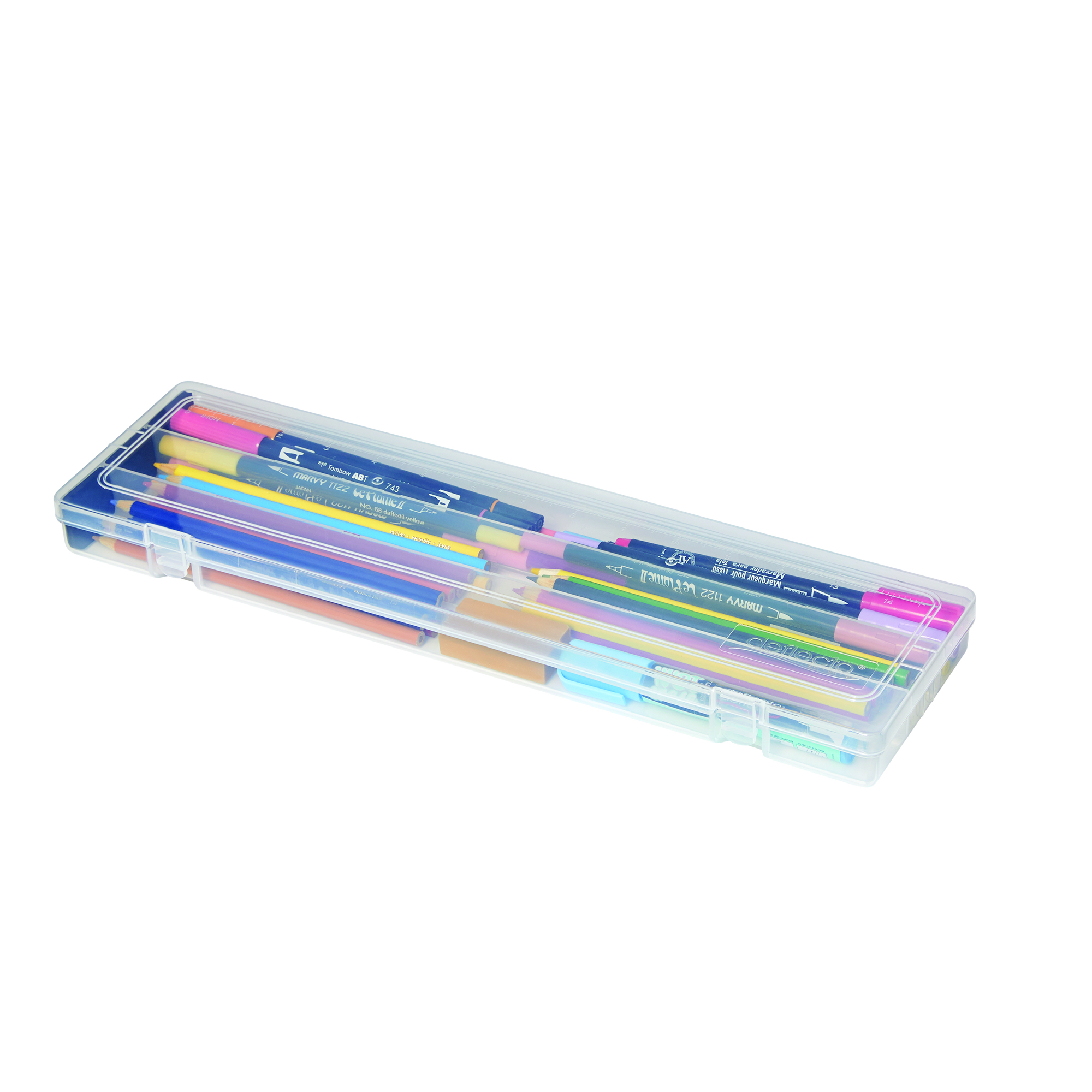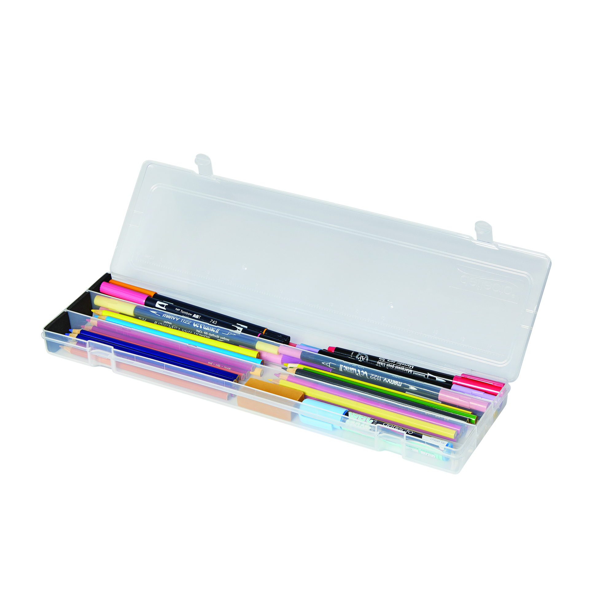 Organize paint brushes, colored pencils, and fine-point pens in this stylish Art Box from Deflecto. Designed for students and fine artists, this clear plastic case lets you see everything inside. The lid includes a ruler, so you always have one when you need it, and we added foam pads to prevent sharp tips from breaking.