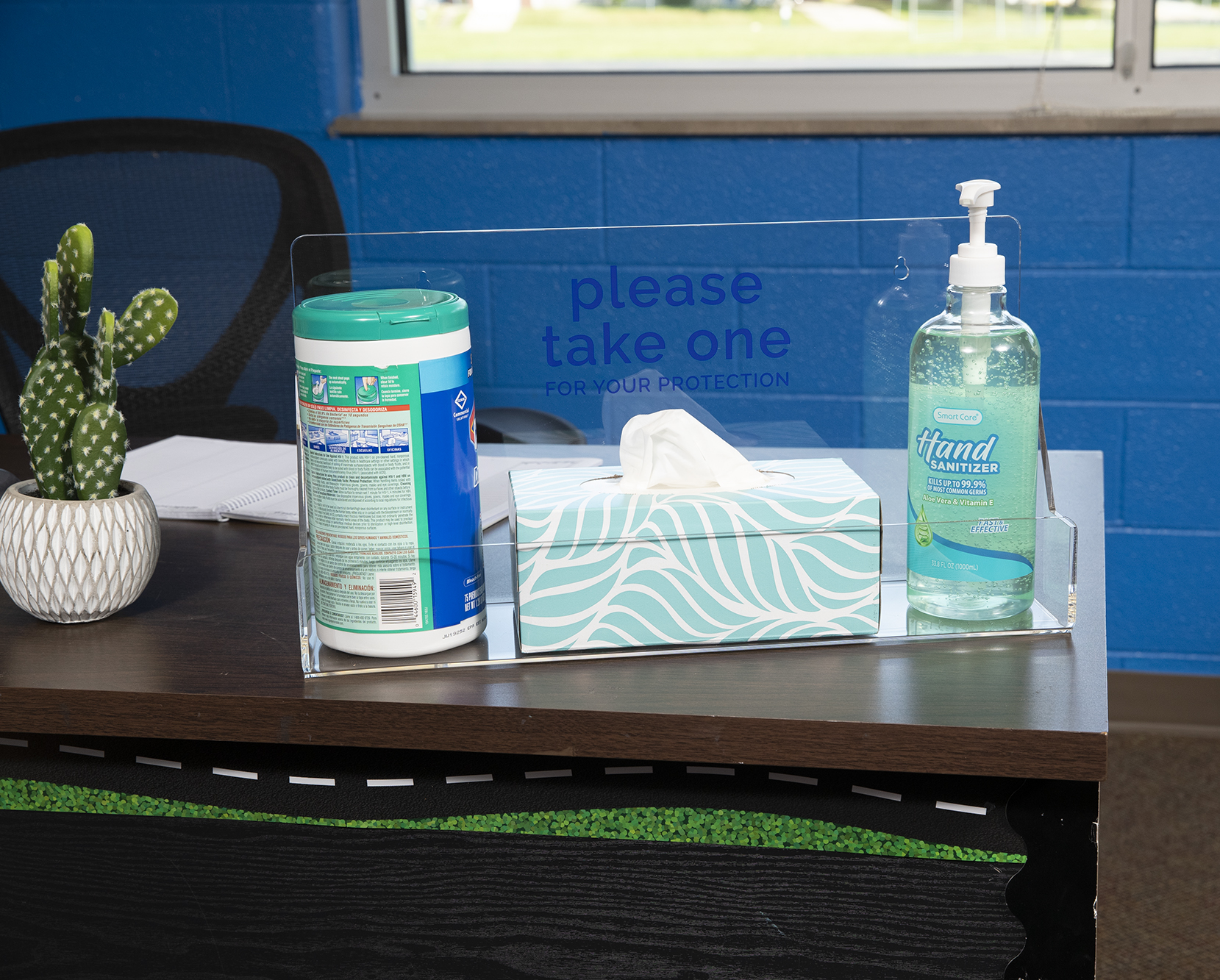 This acrylic organizer provides easy access to cleaning and safety products ideal for use in front offices and classrooms.